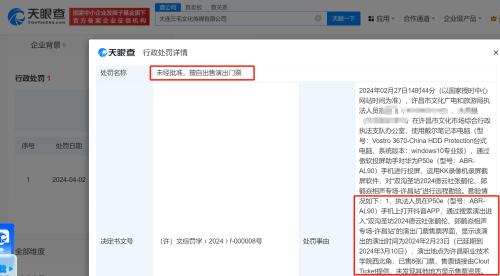 天眼查App显示,近日,大连三毛文化传媒有限公司因未经批准擅自出售演出门票,被许昌市文化广电旅游局罚款1万元。处罚事由显示,今年2月,许昌市文化广电和旅游局执法人员对“双沟圣坊2024德云社张鹤伦、郎鹤焱相声专场-许昌站”进行远程勘验,在抖音APP通过搜索进入门票售票界面,显示已售8张门票,售票链接由Clout Ticket提供,未发现其他地方显示售票资质。