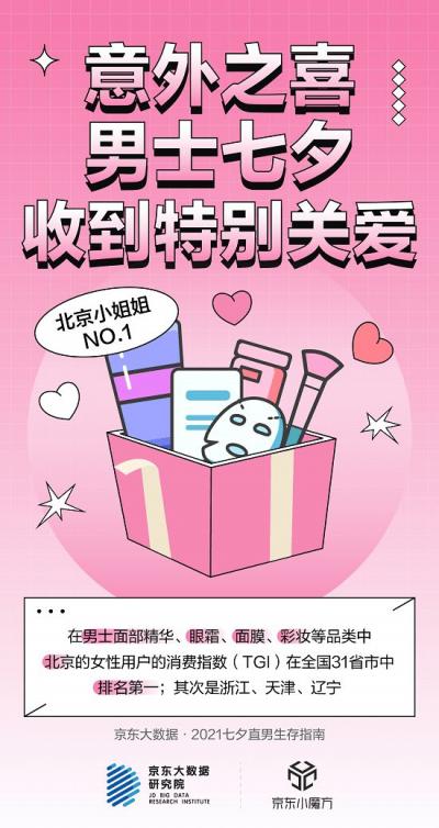 京东大数据显示,每逢情人节日,销量增长最大的品类是美妆护肤、礼品(主要指奢侈品)、珠宝首饰。今年七夕前一周,面部精华成交额同比去年七夕同期增长73%,护肤套装礼盒同比增长50%,珠宝中黄金首饰同比增长130%左右。与“送礼物”相关的搜索词热度不断攀升,“情侣戒指”热度环比增长超过420%。