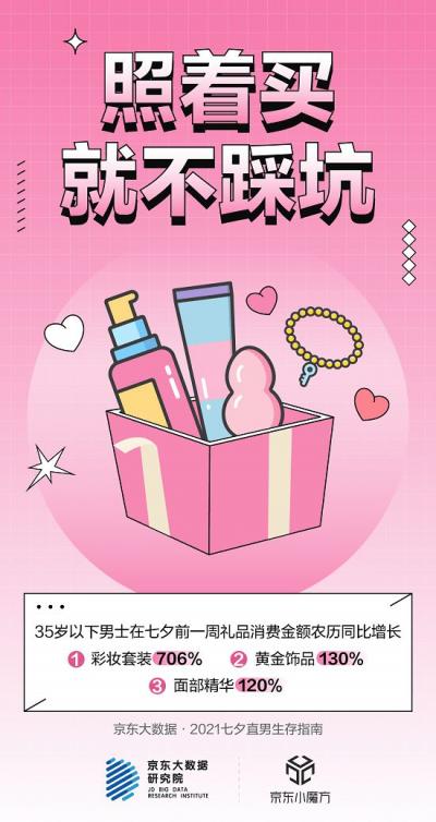 京东大数据发现,除了口红、香水、燕窝之外,七夕前一周,35岁以下男士购买礼品最多为彩妆套装、黄金饰品、面部精华。如果不知道七夕礼物买什么,基本照着这些买就没错了。
