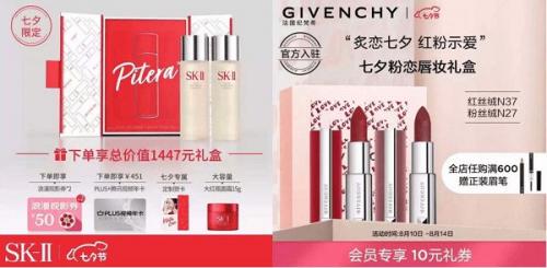 数据显示,七夕前已经有“新品上市即爆”,例如纪梵希(Givenchy)七夕粉恋唇妆礼盒套装,在七夕前一周销量环比上周增长近3倍,完美日记“小细跟口红”粉色皮箱礼盒(永生花宠爱限定版)环比增长约2倍。