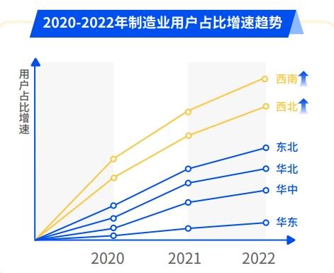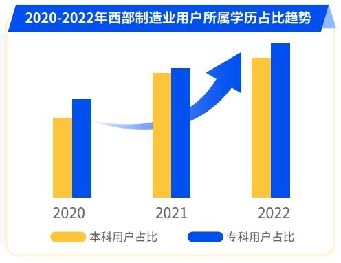 而进一步聚焦至高技能行业中的制造业,得益于“一带一路”带动西部地区承接产业转移,促进该地经济发展动力转向“前沿”,来自西南、西北地区的制造业用户占比增速近三年领跑其他地区,金融服务为西部经济发展提供有力支撑。