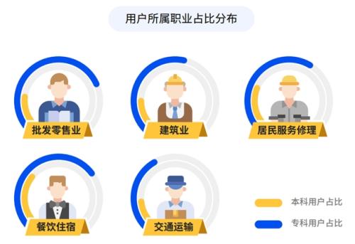 值得注意的是,随着“大国工匠”理念的深化,专科高技能人才被纳入国家战略人才行列。而在对于专业技能要求较低、更贴近居民“衣食住行”的批发零售、餐饮住宿等民生领域的从业人员中,专科用户占比是本科用户的3倍。