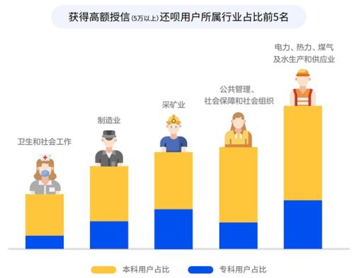 从高学历用户授信额度层面切入,从事电力、热力、煤气及水的生产和供应业,公共管理、社会保障和社会组织等高技能行业的用户因其可替代程度较低、所表现出的风险承担能力更高,更易成为还呗5万元以上授信额度的重点对象。