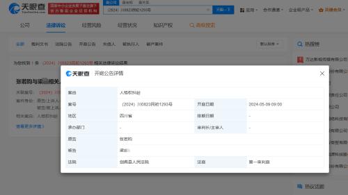 天眼查法律诉讼信息显示,近日,张若昀与梁某人格权纠纷案件新增开庭公告,原告为张若昀,该案将于5月9日在剑阁县人民法院开庭审理。
