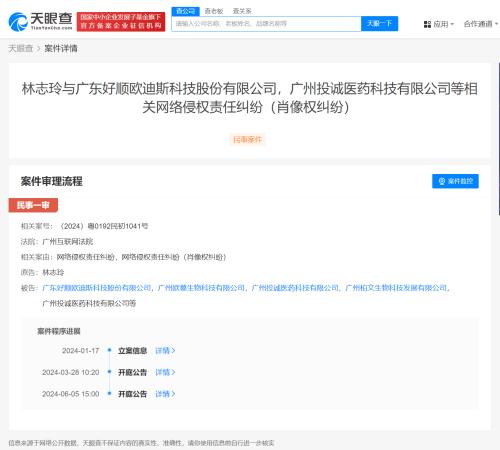 天眼查法律诉讼信息显示,近日,林志玲与广东好顺欧迪斯科技股份有限公司、广州投诚医药科技有限公司、广州欧慕生物科技有限公司等相关肖像权纠纷案件再新增开庭公告,原告为林志玲,该案将于6月5日在广州互联网法院开庭审理。案件流程显示,该案于今年1月立案,法院3月曾首次发布开庭公告。