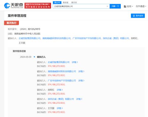 天眼查法律诉讼信息显示,5月9日,正威控股集团有限公司及旗下深圳正威(集团)有限公司、湖南湘威新材料科技有限公司、广安华冠房地产开发有限公司以及王文银、刘结红新增一则被执行人信息,执行标的3.7亿余元,执行法院为湖南省郴州市中级人民法院。