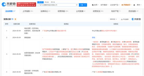天眼查App显示,近日,广东奥马电器股份有限公司发生工商变更,企业名称变更为广东TCL智慧家电股份有限公司,同时,经营范围新增智能家庭消费设备制造、智能家庭消费设备销售、人工智能行业应用系统集成服务、人工智能应用软件开发、物联网设备制造、物联网设备销售等。