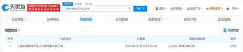 天眼查经营风险信息显示,近日,上海昕美影视文化工作室新增一则简易注销公告,公告期自4月18日至5月8日。