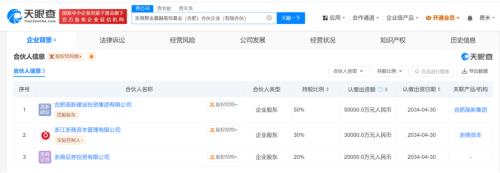 天眼查App显示,近日,浙商聚金嘉融高投基金(合肥)合伙企业(有限合伙)成立,执行事务合伙人为浙江浙商资本管理有限公司,出资额10亿人民币,经营范围为创业投资,以私募基金从事股权投资、投资管理、资产管理等活动。合伙人信息显示,该企业由合肥高新建设投资集团有限公司,浙商证券(601878)旗下浙江浙商资本管理有限公司、浙商证券投资有限公司共同出资。