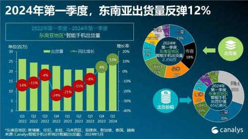 vivo占据12%的市场份额,通过走量产品和重点发展中高端市场确保市场份额。Canalys预测,2024年东南亚智能手机出货量将增长4%。