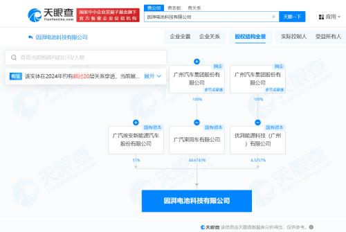 因湃电池科技有限公司成立于2022年10月,法定代表人为古惠南,经营范围含电容器及其配套设备销售、再生资源加工、电池制造、新能源汽车废旧动力蓄电池回收及梯次利用、资源再生利用技术研发等。股权全景穿透图显示,该公司现由广汽集团(601238)旗下广汽埃安新能源汽车股份有限公司、广汽乘用车有限公司、优湃能源科技(广州)有限公司共同持股。