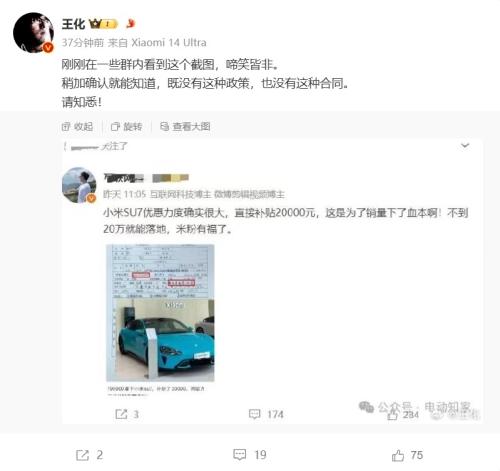 有传闻称小米SU7优惠力度很大,直接补贴20000元,20万就能落地。对此,小米集团公关部总经理王化转发该消息并辟谣称:“刚刚在一些群内看到这个截图,啼笑皆非。稍加确认就能知道,既没有这种政策,也没有这种合同。请知悉! ”