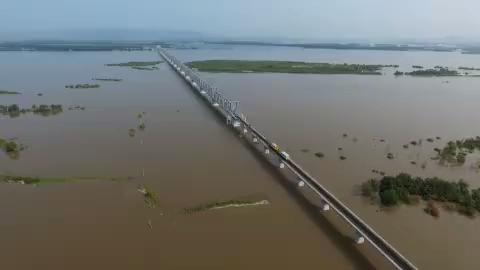 同江中俄黑龙江铁路大桥位于中国黑龙江省同江市、俄罗斯下列宁斯阔耶市之间,全长7194米,其中引桥长4979米、主桥长2215米,中方境内主桥长1886米,俄方境内主桥长329米,设计运营时速100公里,年过货能力2100万吨。