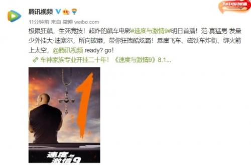 今日腾讯视频官方发布消息,由林诣彬执导,范*迪塞尔主演的动作片《速度与激情9》将在明日(8月18日)全网首播。