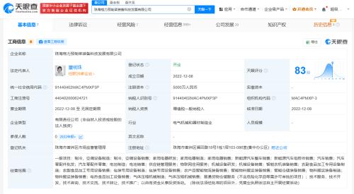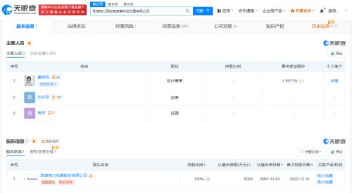 该公司成立于2022年12月,注册资本5000万人民币,法定代表人、执行董事为董明珠,经营范围包括家用电器研发、制造、销售,农副食品加工专用设备制造、销售,农产品智能物流装备销售,电热食品加工设备销售等,由格力电器(000651)全资持股。