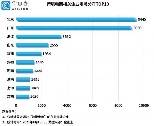地域上,企查查数据显示,我国跨境电商相关企业主要集中在北京、广东等地,分别以9445家和9098家位列第一梯队,浙江以3552家排名第三。