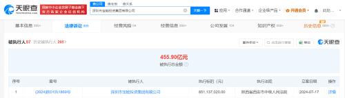 天眼风险信息显示,深圳市宝能投资集团有限公司现存80余条被执行人信息,被执行总金额超455亿元,此外还存在多条限制消费令、失信被执行人(老赖)和终本案件信息。
