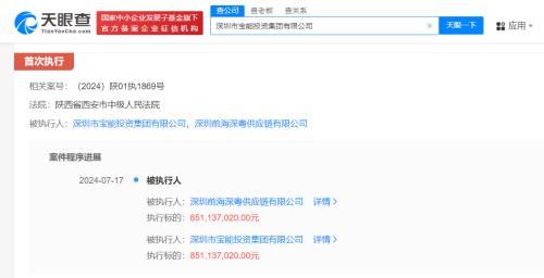 天眼查法律诉讼信息显示,近日,深圳市宝能投资集团有限公司、深圳前海深粤供应链有限公司新增一条被执行人信息,执行标的8.51亿余元,涉及营业信托纠纷案件,执行法院为陕西省西安市中级人民法院。