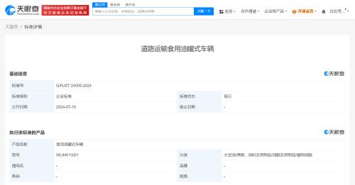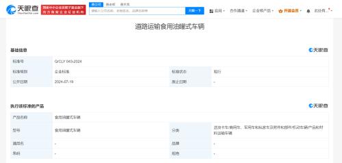 天眼查App显示,近日,中集车辆(301039)旗下3家企业洛阳中集凌宇汽车有限公司、芜湖中集瑞江汽车有限公司、扬州中集通华专用车有限公司新增“道路运输食用油罐式车辆”相关企业标准信息,标准号分别为Q/CLY 043-2024、Q/RJST 24005-2024、Q/321091THB 22-2024。