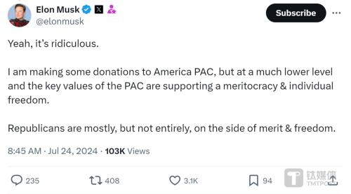 马斯克7月24日在社交媒体平台X上再次发布推文否认每月向特朗普进行4500万美元的巨额捐款,他表示只是向一个支持特朗普竞选总统的超级政治行动委员会(PAC)“提供了一些捐款”,但数额比外界报道的每月4500万美元“低得多”。“这太荒谬了。”马斯克评论称。这已经不是马斯克第一次否认“每月向特朗普捐款4500万美元”传闻。