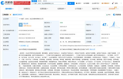 十个勤天(杭州)农业发展有限责任公司成立于2023年2月,法定代表人、董事、总经理为杨长岭,董事长为蒋敦豪,注册资本1万人民币。股东信息显示,该公司由杨长岭、刘博分别持股70%、30%。