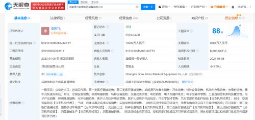 成都格力新晖医疗装备有限公司成立于2020年4月,注册资本1亿人民币,经营范围含货物进出口,第一类医疗器械销售,第二类医疗器械销售,新能源汽车整车销售,制冷、空调设备销售,家用电器销售,医护人员防护用品零售等。股东信息显示,该公司由格力电器(000651)、成都国生创新科技服务有限公司、成都新鹭生物科技有限公司、珠海广通汽车有限公司共同持股,其中格力电器(000651)持股75%。