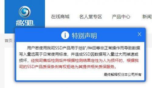在影驰的官方网站以及该公司位于京东和天猫的旗舰店中,都能够看到醒目的告示,表示因为挖矿产生的数据量远远大于日常使用标准,因此导致的硬件损坏该公司将有权拒绝提供质保服务。