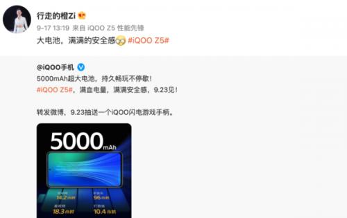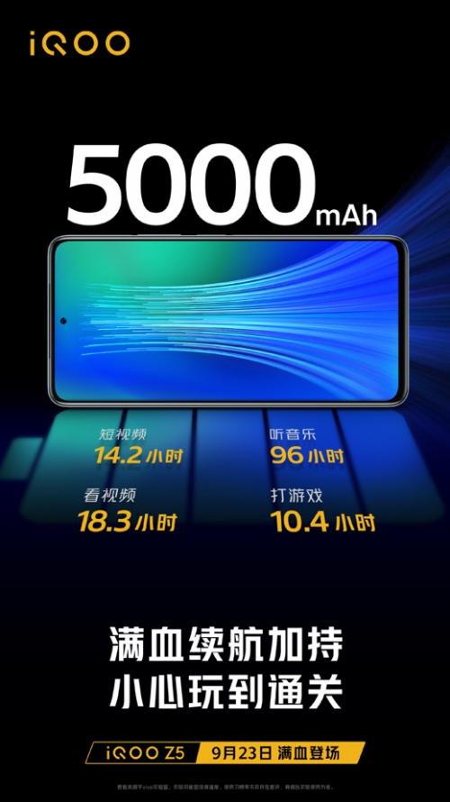 9月17日,iQOO官方微博宣布,即将发布的iQOO Z5将搭载5000mAh大容量电池,带来超持久的续航体验,喜欢长续航的用户不可错过。此外,官方还放出了iQOO Z5的正面外观图,更窄的边框、下巴及中孔,让不少人眼前一亮。