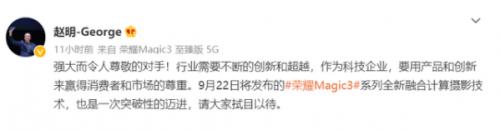 继苹果发布会以来,各大手机厂商纷纷官宣了旗下的一些新产品或是新技术的发布会时间。其中,荣耀CEO赵明表示荣耀将在9月22日发布荣耀Magic3系列全新融合计算摄影技术,他形容这次发布的技术是一次突破性的迈进,请大家拭目以待。