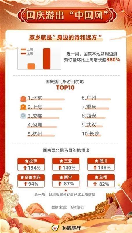 近日,知名在线旅游平台飞猪发布了最新的预测数据,其中北京成为国庆热门目的地第一名,成都挤进前三。另外两大一线城市深圳和广州也在列,分别排名第四和第六。此外,重庆、西安、武汉和长沙也进入十一假期全国热门目的地前十。