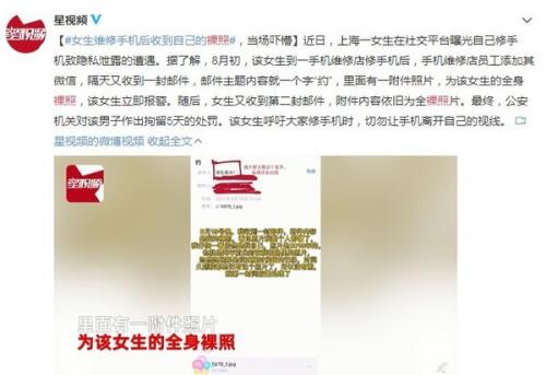 据报道,上海一女大学生最近去维修手机,却泄露了自己的私密照片,被维修工敲诈勒索。据她回忆,在今年8月份,她的手机突然自动关机,于是前往松江大学城附近的一家手机维修店去修手机,结果第二天就收到了维修店员工的微信好友请求。