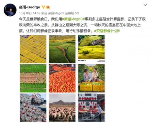 10月16日是世界粮食日,赵明分享了一组用荣耀Magic3系列多主摄融合计算摄影,记录下的欣欣向荣丰收之景。从群山之巅到大海之滨,一场秋天的盛宴在中国大地上演。由荣耀Magic3系列拍摄的这组照片,色彩鲜明、亮丽,层次清晰,人物生动,感染力强。