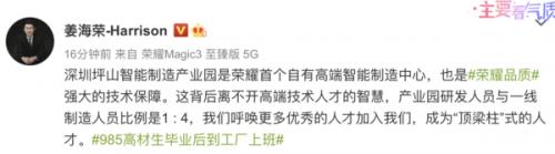 近些日子,有许多985、211大学的高材生选择了进厂工作,这些学生认为高新技术的制造业非常有前景。对此,荣耀公司的CMO姜海荣也发表了自己的看法,他认为:一个优秀公司的背后离不开高端技术人才的智慧,荣耀深圳坪山智能制造产业园研发人员与一线制造人员比例是1 : 4,我们呼唤更多优秀的人才加入我们,成为“顶梁柱”式的人才。