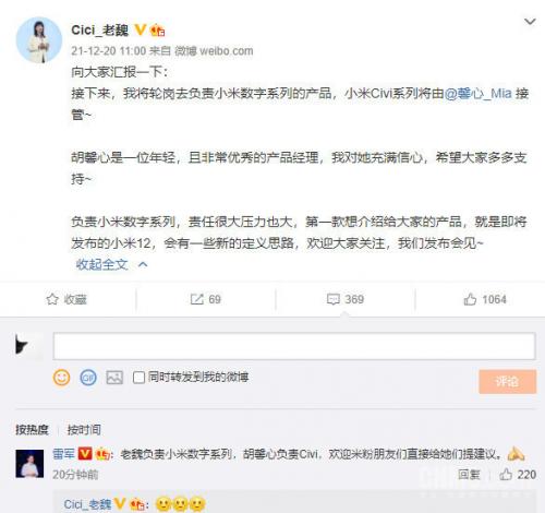 对此,雷军也在评论区表示,老魏负责小米数字系列,胡馨心负责Civi系列,欢迎米粉朋友们直接给她们提建议。