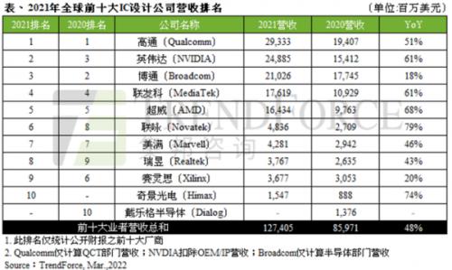 据CNMO了解,TrendForce集邦咨询在3月24日公布了最新的研究数据。2021年,各类终端应用需求强劲使得晶圆缺货成为常态,全球IC产业出现严重供不应求的情况。在供需关系不平衡的状况下,芯片价格也随之上涨。整体来看,2021年全球前十大IC设计公司的营收达到夸张的1274亿美元,同比增长率高达48%。