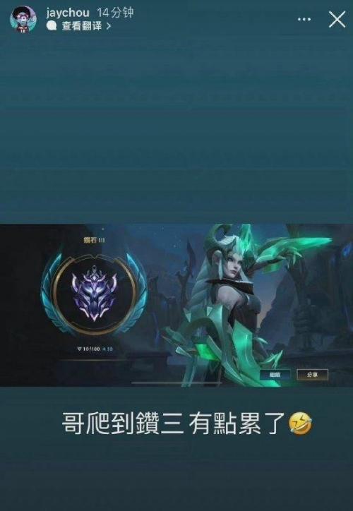 近日,周董在海外的社交平台上展示了自己《英雄联盟手游》达到钻三段位的截图,并表示:“哥爬到钻三,有点累了”。与周杰伦一样,很多人都是这个游戏的非职业玩家,并没有那么多时间和精力花在游戏上,能“爬”到钻三已经实属不易。