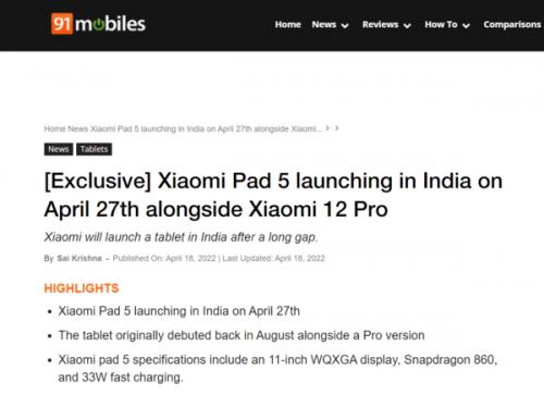 此前,小米通过印度官方Twitter宣布,其将于4月27日在印度召开发布会,届时将在印度市场推出小米12 Pro 5G旗舰手机。4月18日,据91mobiles的报道,小米的此次发布会除了小米12 Pro外,还将在印度市场推出旗下平板电脑――小米平板5。