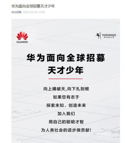 4月25日,华为再次宣布面向全球招募“天才少年”。“向上捅破天,向下扎到根。”华为表示,“如果您有志于探索未知、创造未来,加入我们,用自己的聪明才智,为人类社会的进步做贡献!”华为“天才少年”不限学历,不限学校。但需要在数学、计算机、物理、材料、芯片、智能制造、化学等相关领域有特别建树并有志成为技术领军人物。重量级科研成果/论文/专利、顶尖实验室/尖子班毕业、国际顶级赛事获奖是“加分项”。