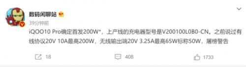 作为最早使用120W快充的手机厂商之一,iQOO自iQOO 7系列开始,便给手机配备了120W快充,这在当时可以说是最强手机快充之一了。在接下来的几代机型中,iQOO依旧一直采用的都是120W快充,随着各家手机厂商快充的普及,120W快充在当今也没有了当初刚推出时那么惊艳。不过有数码博主爆料称,iQOO为最新的iQOO 10 Pro搭载了200W快充,充电器型号为V200100L0B0-CN,支持最高20V 10A充电。此外,该机还支持最高20V 3.25A最高65W的无线充电(标称50W),在充电速度上或将再度屠榜。