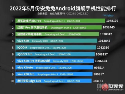 近日,知名跑分平台安兔兔公布了安卓旗舰手机5月性能排行榜Top10,我们可以看到,排名前十的大部分是搭载骁龙8移动平台的手机。