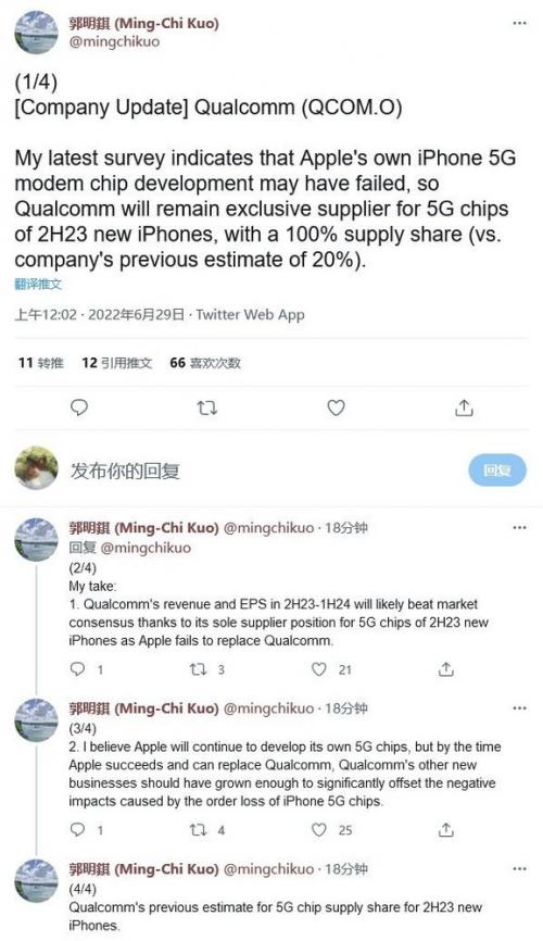 6月29日早间消息,知名分析师郭明Z表示,最新调查表明,苹果5G基带芯片研发可能已经宣告失败,毫无疑问,高通将继续成为2023年新款iPhone的5G芯片独家供应商,供应份额为100%。或许高通之前对苹果太有信心,此前其预估的供应份额仅为20%。