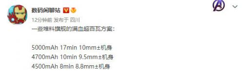 7月15日,有数码博主爆料了三款号称“堆料旗舰”的超百瓦快充方案:第一款内置5000mAh大电池,其可以做到17分钟充满电,不过机身不是很薄,在10mm上下;第二款的电池小一些,但也有4700mAh,其充电速度低至10分钟,机身厚度则在9.5mm左右;第三款手机的快充方案最令人期待,其配备4500mAh,充电时间直接拉低到8分钟,而且机身是三款手机中最薄的――约8.8mm。