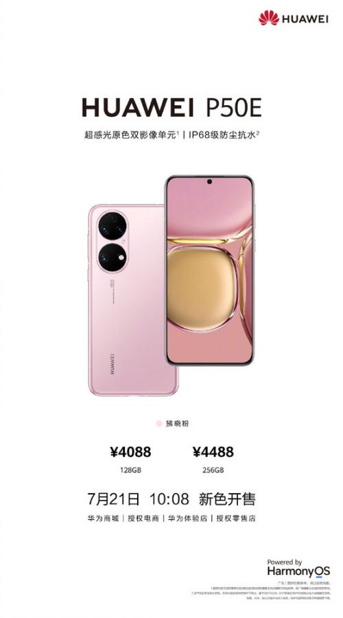 此前,有爆料称华为P50E拂晓粉会在7月21日上市,不过新配色今天就上市了,目前已经在华为商城上架。据官方消息,华为P50E拂晓粉将于7月21日上午10:08正式开售,起售价为4088元。