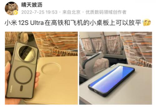 此前,小米发布新款旗舰手机小米12S Ultra,由于后摄模组巨大,给予了很多配件厂商创作灵感,五花八门的手机壳频发。近日,知名数码博主“晴天披沥”发文表示,小米12S Ultra在高铁和飞机的小桌板上可以放平。众所周知,一般小桌板上都有一个放杯子的槽位,而小米12S Ultra刚好能嵌入其中,可以说是“严丝合缝”,高铁和飞机被很多人戏称为“手机壳”。