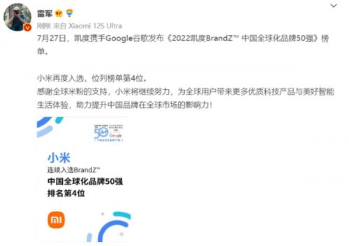 7月28日,雷军在社交平台向大家分享小米最近获得的一项成就――在《2022凯度BrandZ中国全球化品牌50强》榜单中再度入选,位列榜单第四位。