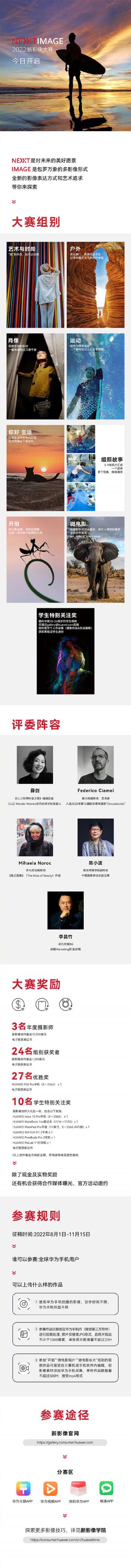 8月2日,华为2022新影像大赛全球正式开启,主题为“NEXT IMAGE”。其中NEXT是对未来的美好愿景,IMAGE是指包罗万象的多影像形式。