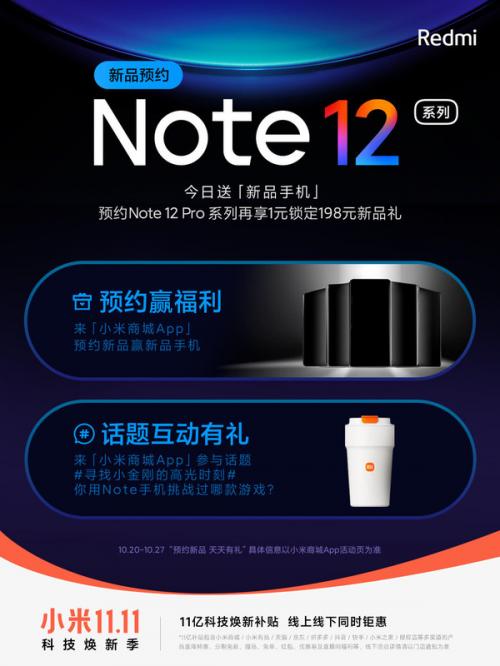 10月20日,Redmi红米手机正式官宣新机――Note 12系列。新机将于10月27日正式发布,现已开启预订。10月24日,手机中国了解到,官方宣布,今日上小米商城预约新品Note 12系列,可以抽送“新品手机”。