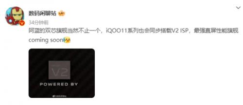 11月11日,手机中国注意到,此前经常爆料新机信息的某数码博主爆料称:“阿蓝的双芯旗舰当然不止一个,iQOO11系列也会同步搭载V2 ISP,最强直屏性能旗舰coming soon!”