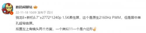 自从高通发布骁龙8 Gen2移动平台后,各大厂商都在筹备新机,今年年底到明年年初预计有一大批新机亮相。11月18日,数码博主“数码闲聊站”爆料“骁龙8+新机6.7英寸±2772×1240p 1.5K柔性屏,这个是原生2160Hz PWM,但是居中单孔超窄曲屏。后置左上角镜头两个方案,一个类似11一个是六边形。”