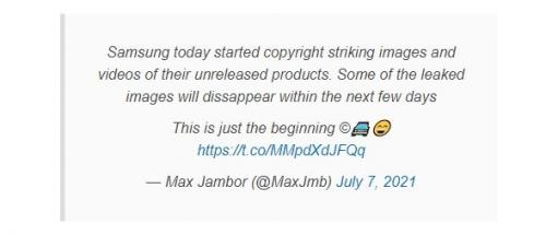 据悉,三星可能对一些特定类型的爆料“下手”。据“All About Samsung”的@MaxJmb的说法,该公司已开始针对未发布产品的泄露图像和视频援引版权法。简而言之,他们声称这些泄密内容包含受版权保护的材料,泄密者没有发布它们的任何合法权利。据报道,苹果上个月开始追查中国的泄密来源,而三星的行动可能是这家大型科技公司打击这些泄密来源的开始。